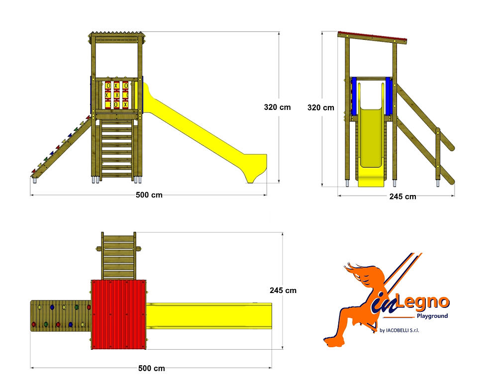 E' sviluppata su un unico livello e prevista di uscita con scivolo aperto alto h. 150, di giochi colorati didattici adatti a stimolare la curiosità dei bambini e di salite arrampicata tipo roccia e scala gradini con corrimano laterali e scala verticale in tubi colorati per stimolare il senso di avventura dei bambini di età diverse.